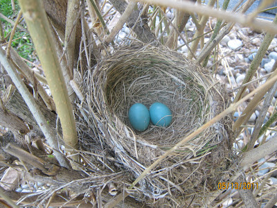 I stumbled upon this nest one day and here is what I found...only now there are 4 eggs. They are so pretty.